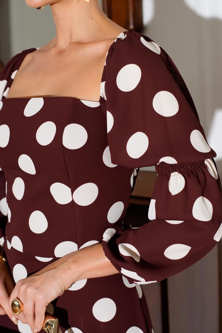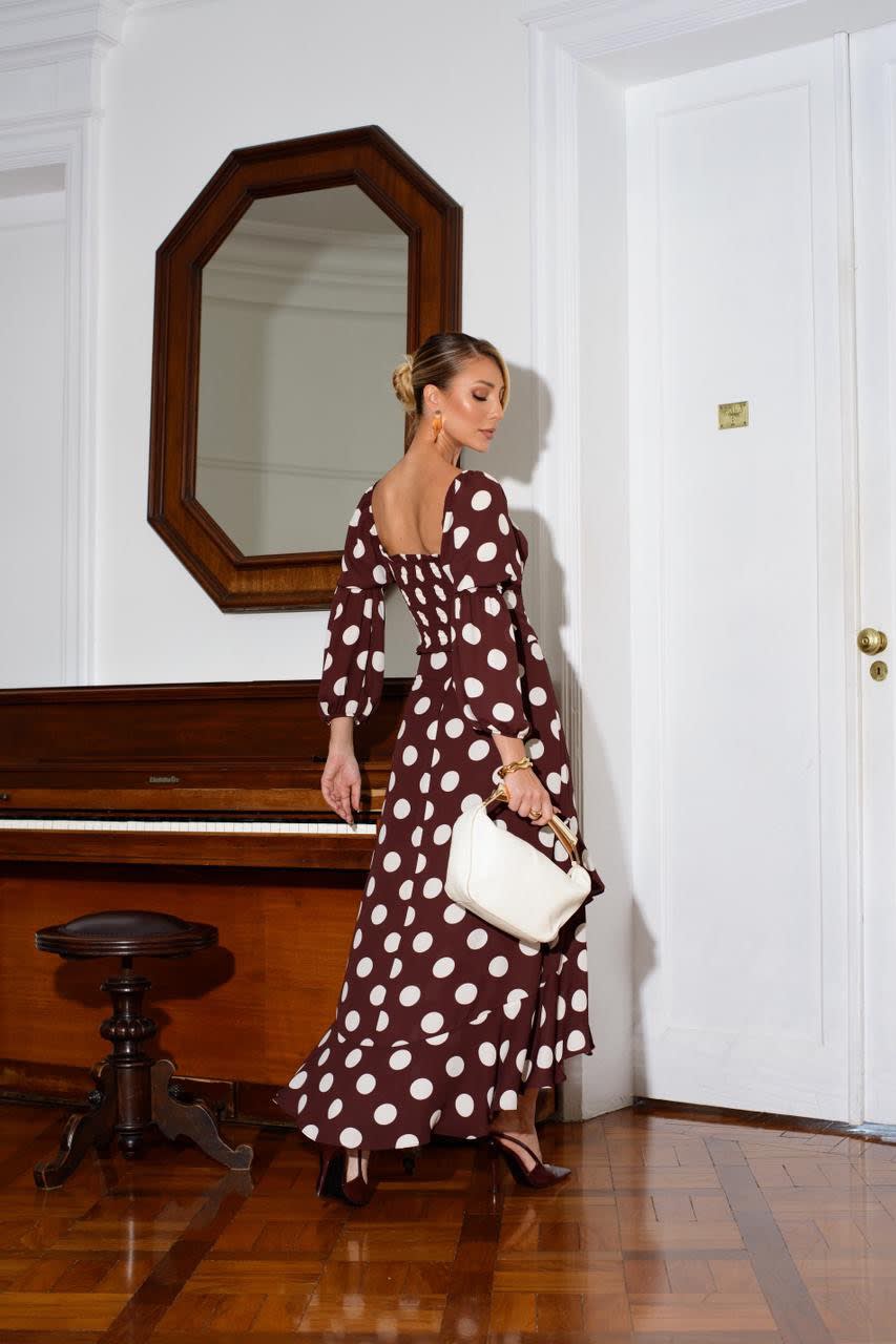 Conjunto com blusa estilo corpete de mangas bufantes e saia com babados e fenda frontal.